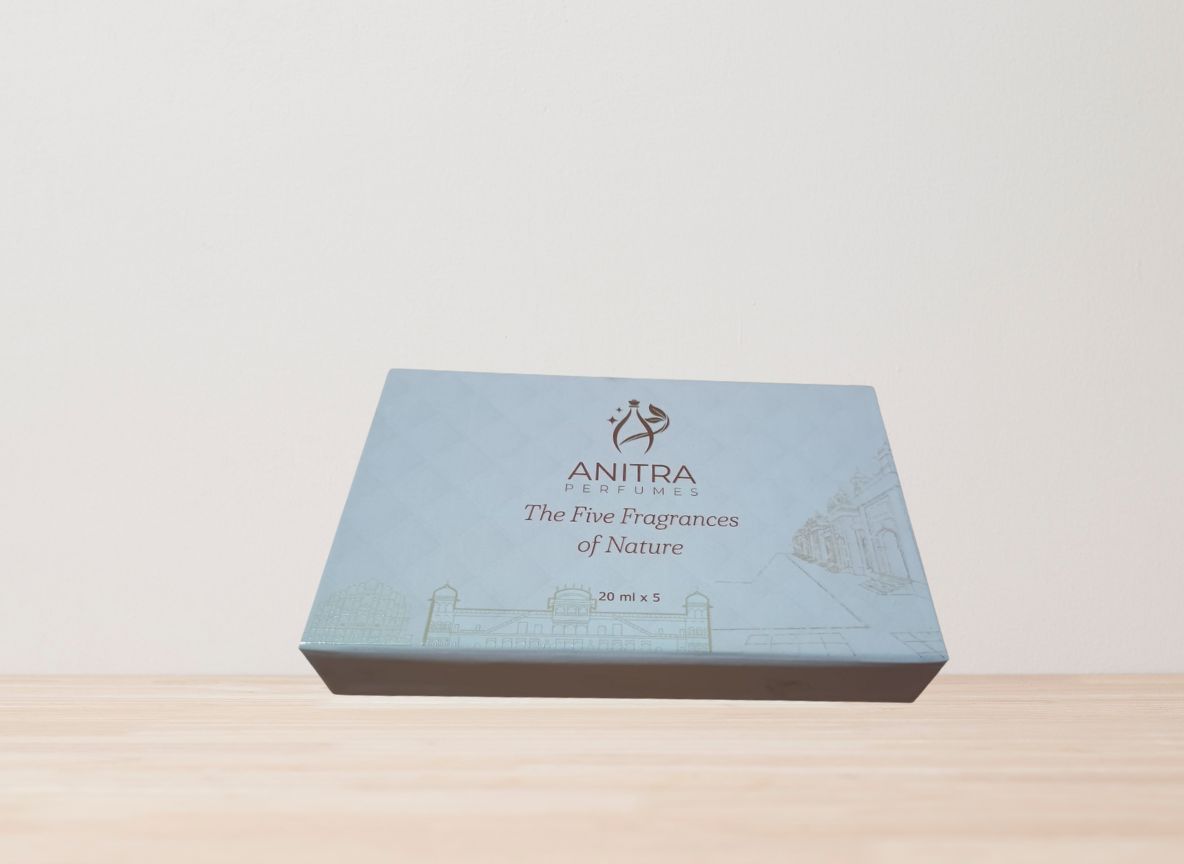 Gift pack containing 5 premium perfumes: White Oud, Gulab, Shanaya, Gucchi Flora, Most Wanted, each 20ml, perfect for personal use or gifting.